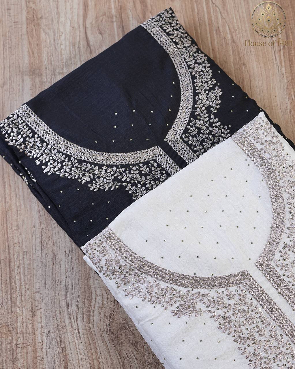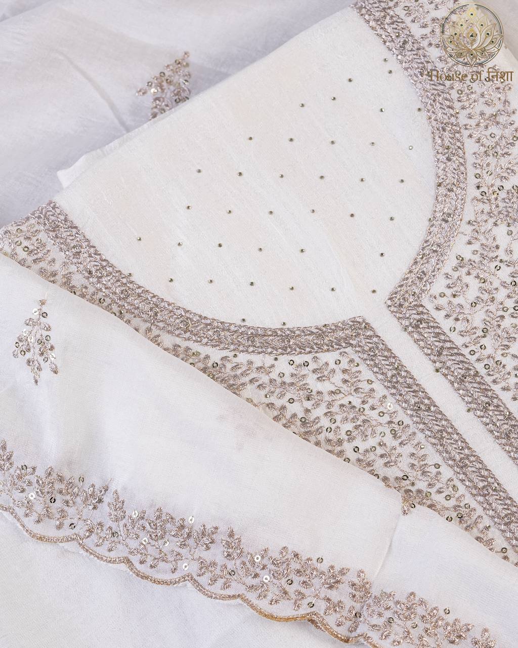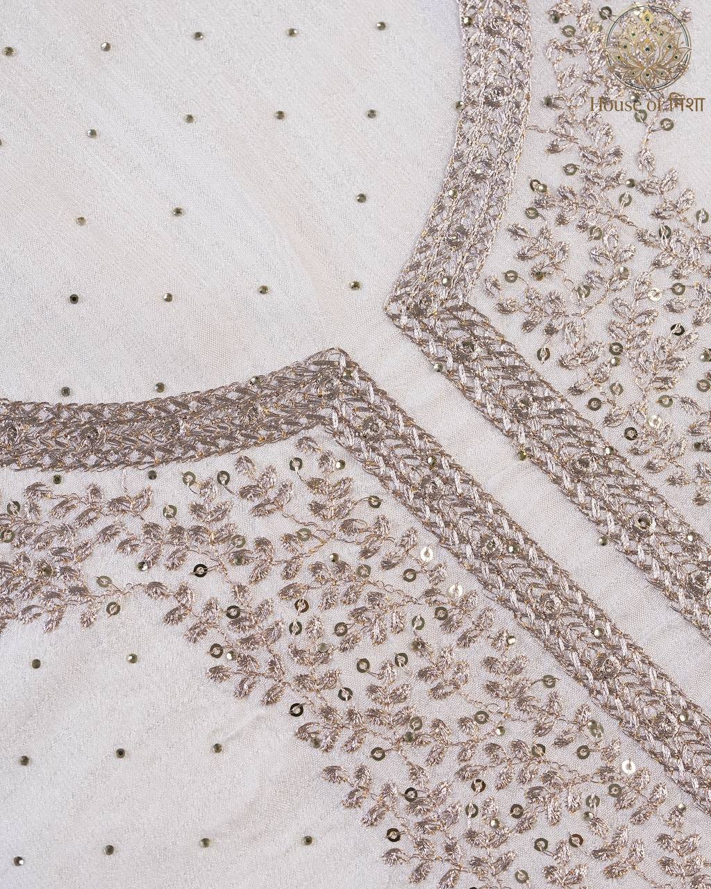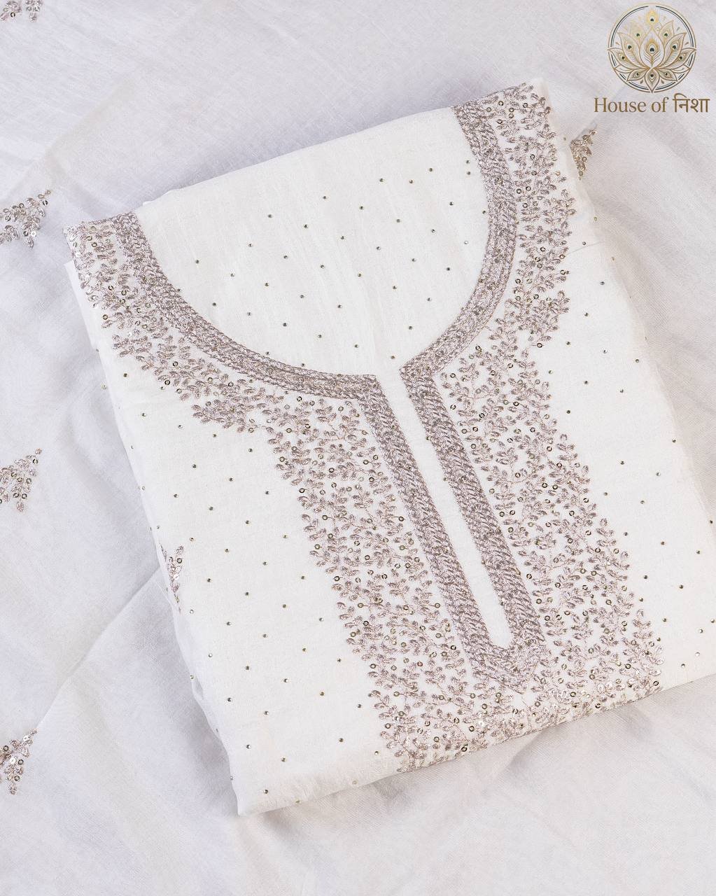 Elevate your festive wardrobe with this timeless Embroidered Unstitched Dress Material from House of Nisha. Designed with delicate embroidery and subtle embellishments, this elegant ensemble blends traditional charm with modern sophistication. The graceful neckline detailing and minimal scattered work create a refined and luxurious look, perfect for festive occasions and special gatherings.